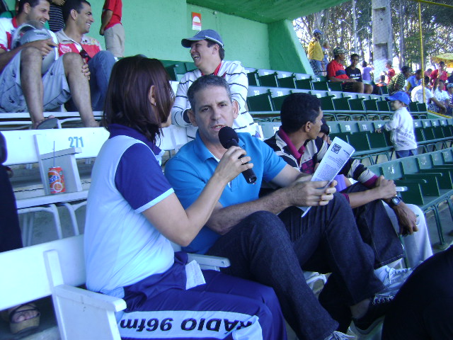 Patrícia Oliveira entrevistando o treinador Leivinha