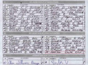A súmula assinada pelo árbitro Lúcio José Silva de Araújo e pelos capitães das duas equipes aponta uma substituição diferente. De acordo com o documento oficial, foi o atacante Adailton quem entrou em campo aos 24 minutos do segundo tempo em substituição a Júnior Timbó. Uma mudança que não aconteceu. Veja na primeira imagem acima a súmula da partida com Elkeson com a camisa 17 e Adailton com o número 18 – ambos no banco de reservas. Na segunda imagem, a substituição relatada pelo árbitro, com Adailton Santos Silva entrando no lugar de Jorge S. Júnior.