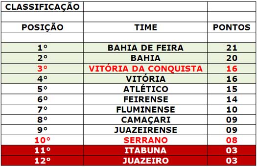 Após o encerramento da nona rodada, o Vitória da Conquista permaneceu na terceira colocação com 16 pontos e fará na sequência da competição, duas partidas dentro de casa contra Feirense e Juazeiro, respectivamente.