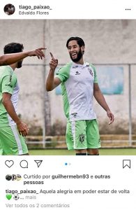 O atleta postou em suas redes sociais sua volta ao elenco alviverde em um treinamento no Estádio Edvaldo Flores durante a semana. “Aquela alegria em poder estar de volta”, disse Tiago em seu post.