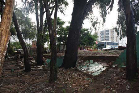 Devido aos fortes ventos, parte do muro do estádio Lomanto Júnior foi derrubado.